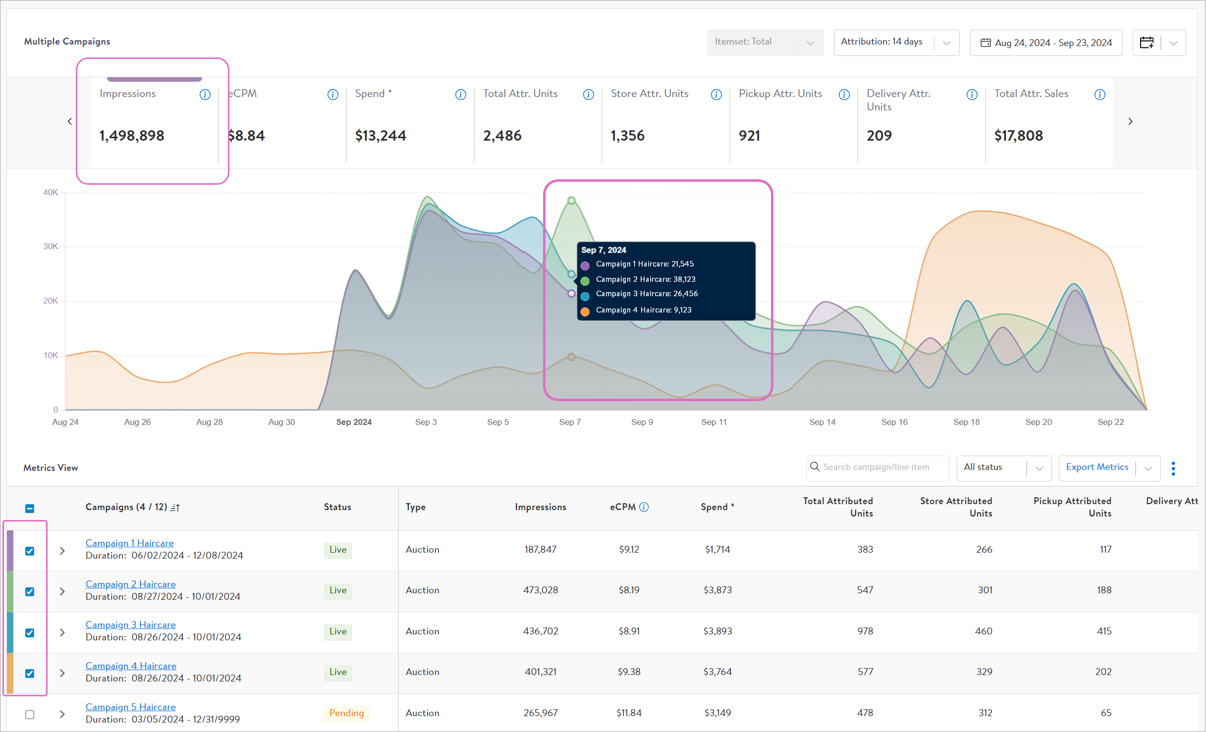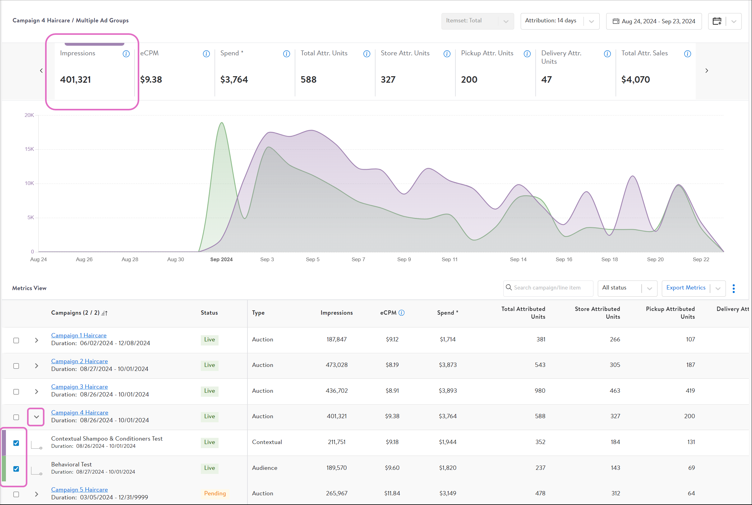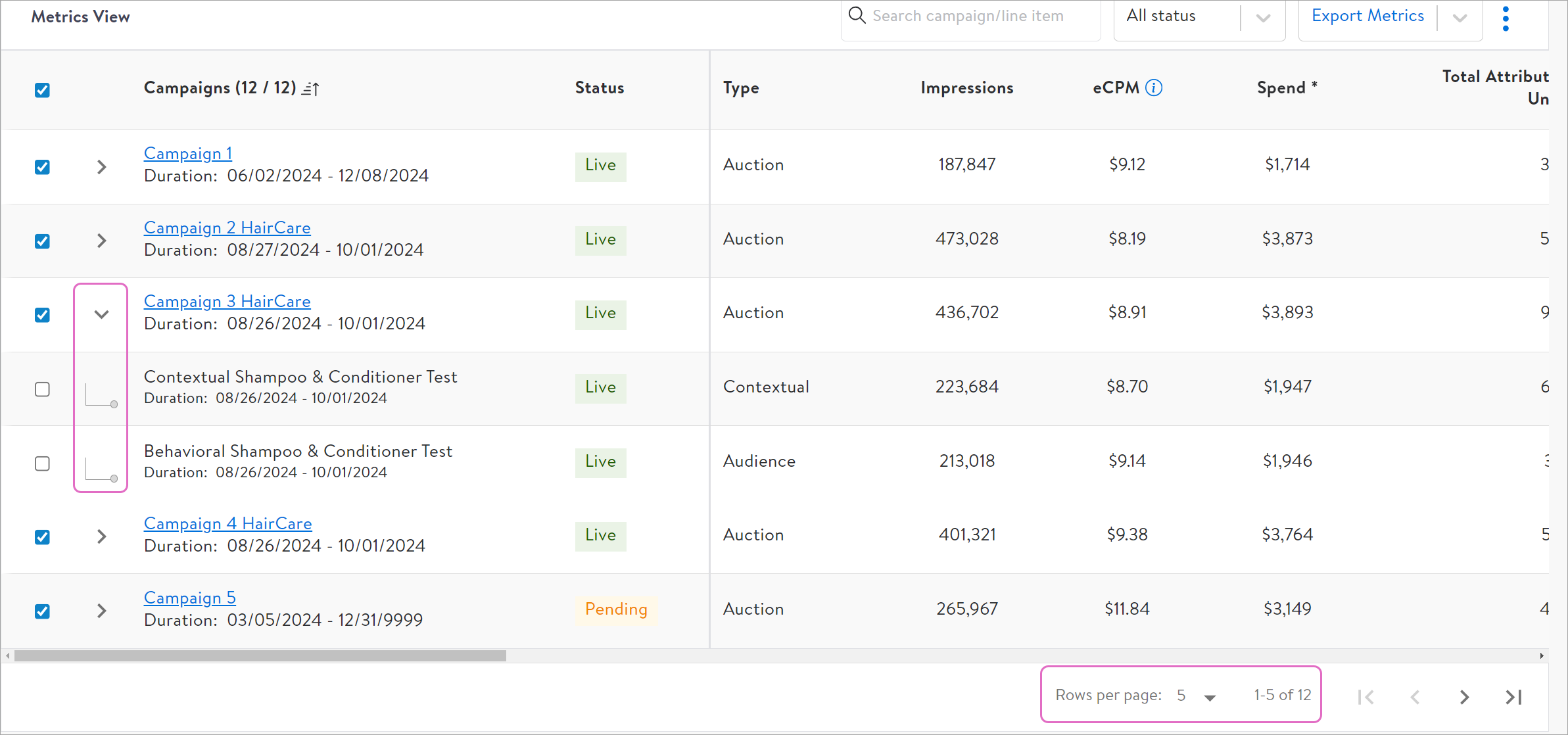 在“Metrics View”部分勾选想要查看的广告活动或者广告组数据。每页默认展示5个广告活动,最多可以调整为30个广告活动每页。同时,点击每个广告活动左侧的箭头下拉可查看该广告活动下广告组的表现。