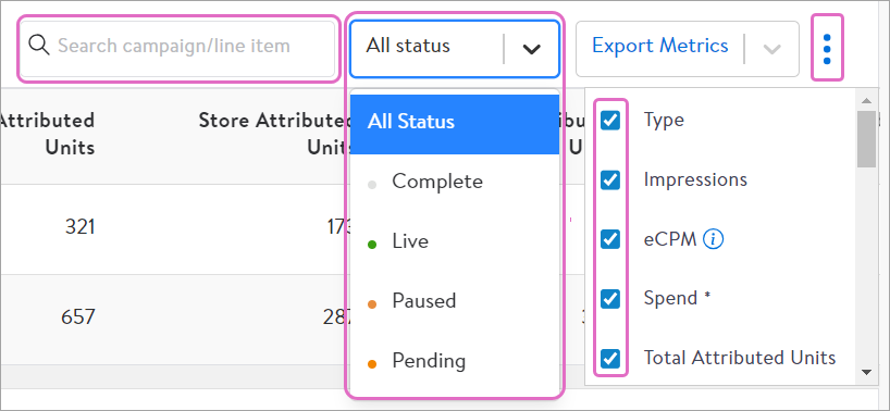 在列表右上角,可以通过搜索词快速查找特定的广告活动与广告组,或者通过状态筛选不同的广告。最右侧三个垂直小点可以自定义列表欲展示的指标。