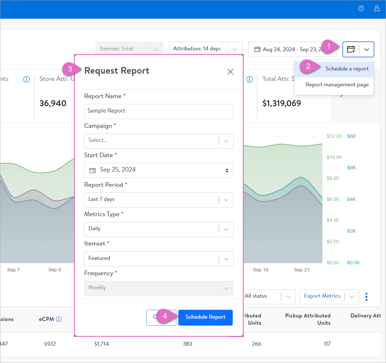 如果要设置定时报告,主要查看“All Campaigns”右上角,共分为4步: