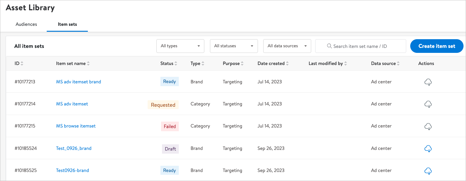 后续可回到“Item sets”板块查看创建状态,显示为“Ready”时可以投入使用,“Requested”表示商品集正在生成,“Failed”表示请求的商品数量不足或者出现其他问题,需要重新构建。
