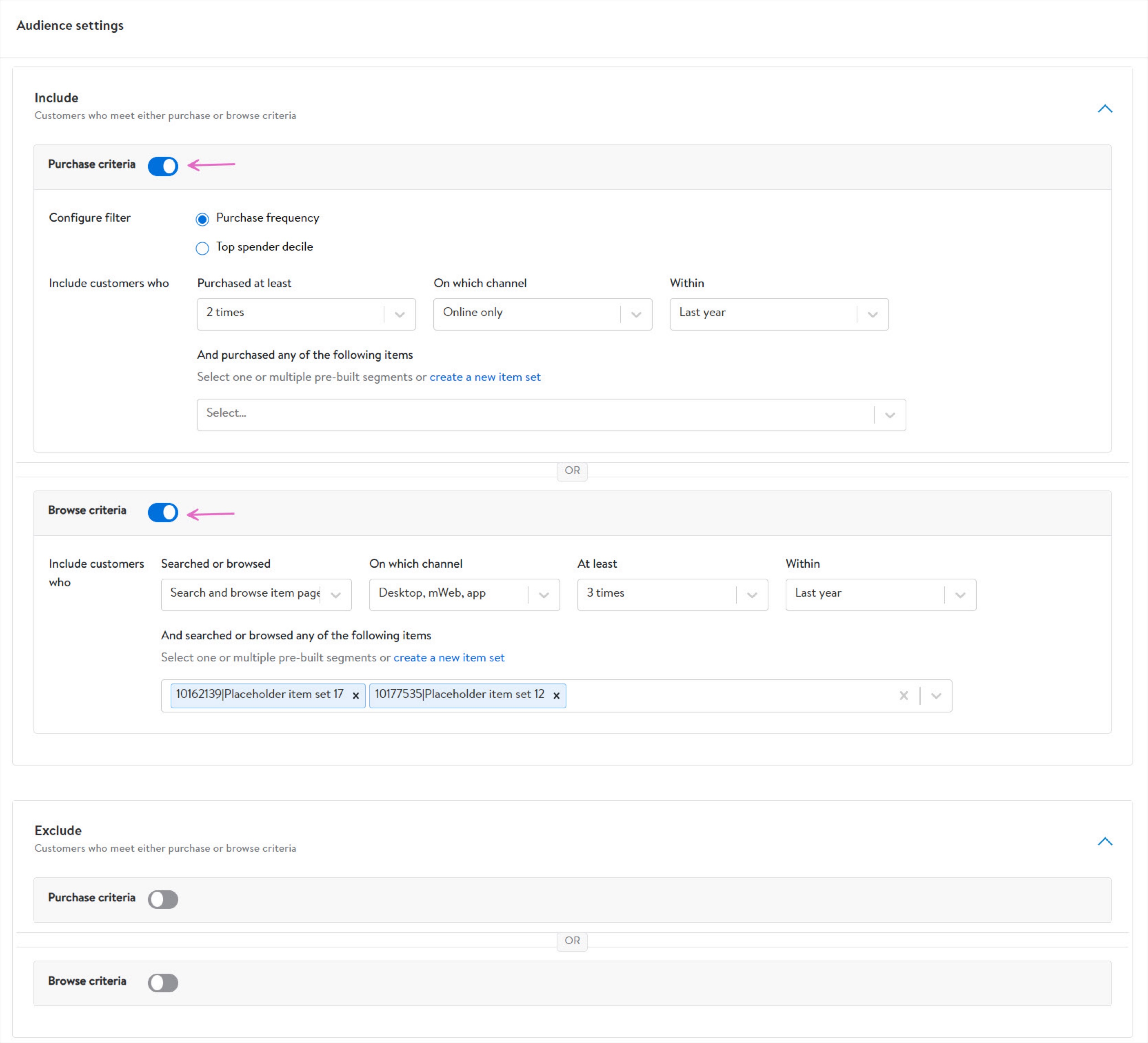 在规则设定里,我们可以根据用户购买或者浏览行为分别设置规则。在Purchase criteria里,以购买频率或者消费等级为筛选条件,同时设置更具体的数值,并添加预先创建好的targeting item sets,满足选中商品购买规则的人群将会被提取出来;在Browse criteria里,以过去的搜索和浏览行为作为筛选条件,设置回溯窗口、渠道等具体数值,并添加targeting item sets,满足选中商品浏览规则的人群将会被提取出来。此外,如果有排除特定人群的需求也可以在“Exclude”添加规则。