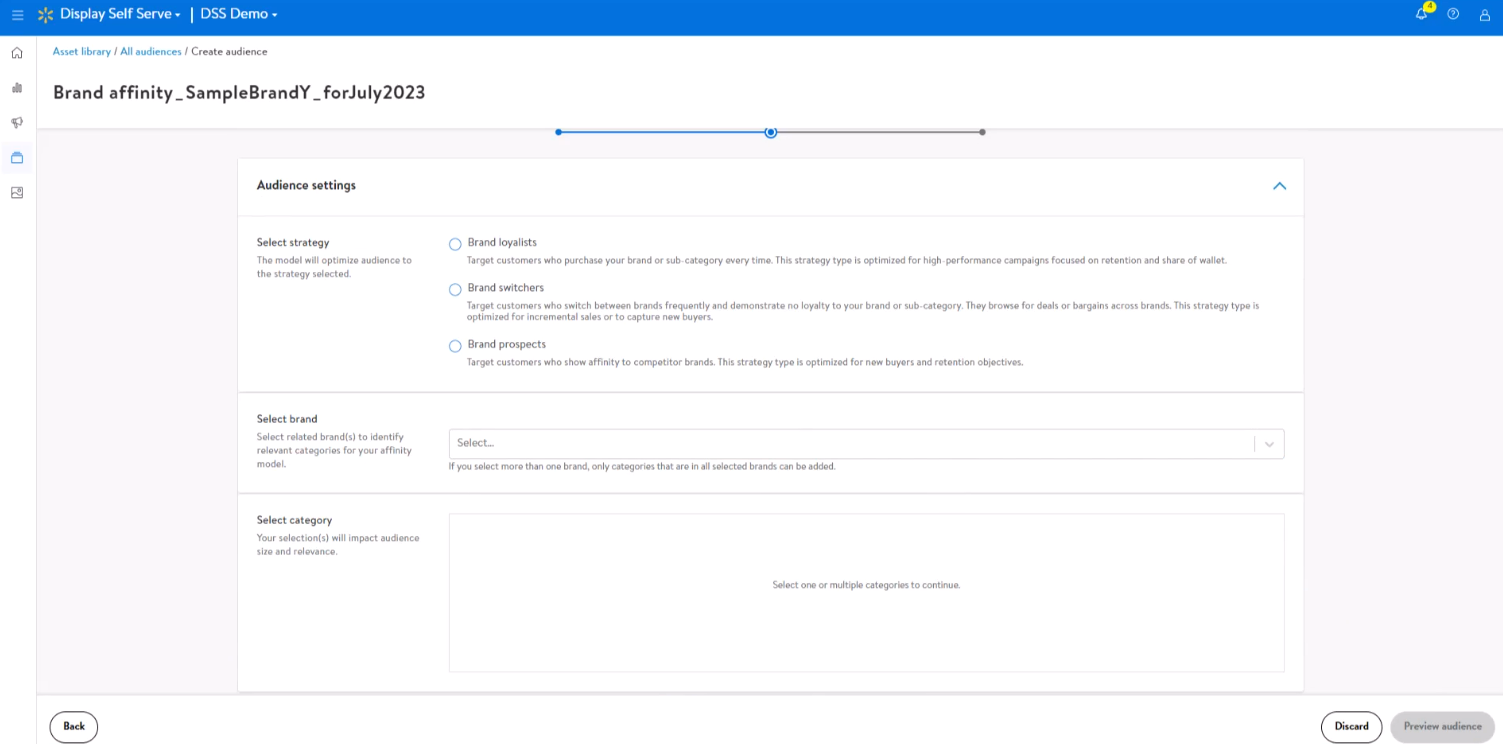 如果选择“brand affinity”,在选择特定的优化目标后,根据活动目标选择策略(此处只能单选。若想增加策略,可创建多个brand affinity)。Brand loyalists主要针对经常购买本品牌商品的用户,提高用户留存率。Brand switcher针对为寻找最佳优惠而不断更换购买品牌的用户,扩充新流量。Brand prospects针对其他品牌的购买用户,同样有利于挖掘新用户。