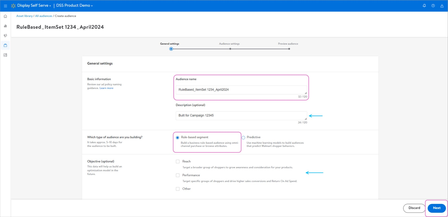 在创建设置里,填写受众名称与描述(选填),点击“Rule-based segment”,并根据投放目标选择优化方向(选填)。