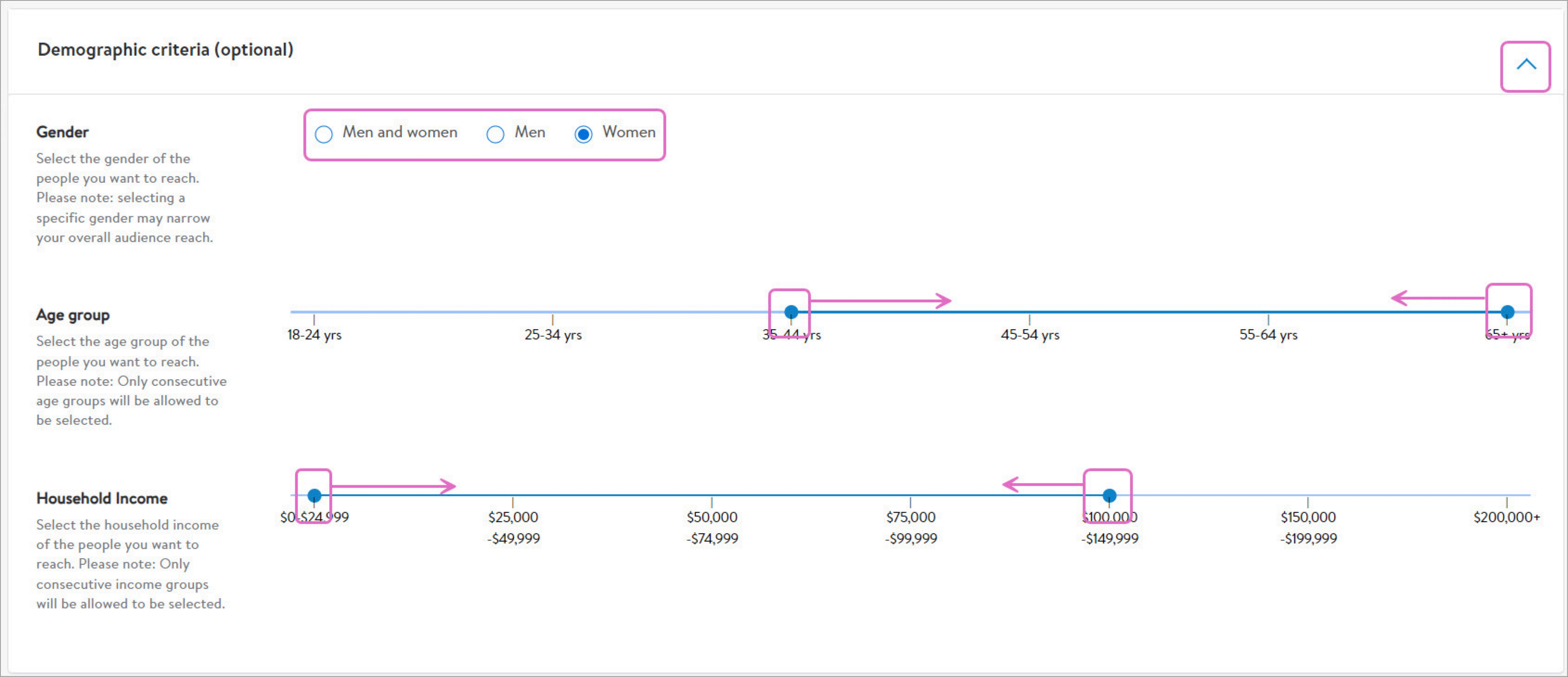 在设置好购买和/浏览规则后,我们还能在此基础上添加人口统计信息与地理位置条件,进一步提高受众精度。