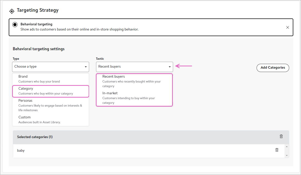 在Type里选择“Category”,Tactic选择对应受众,并添加品类。在沃尔玛Onsite Display平台,品类层级由大到小分别为department – category – subcategory,在添加品类过程中,可以选择定位较高层级的品类,以触达更广范围的受众;或者定位较低层级的品类,以触达更精准的受众,具体选择根据广告目标确定。