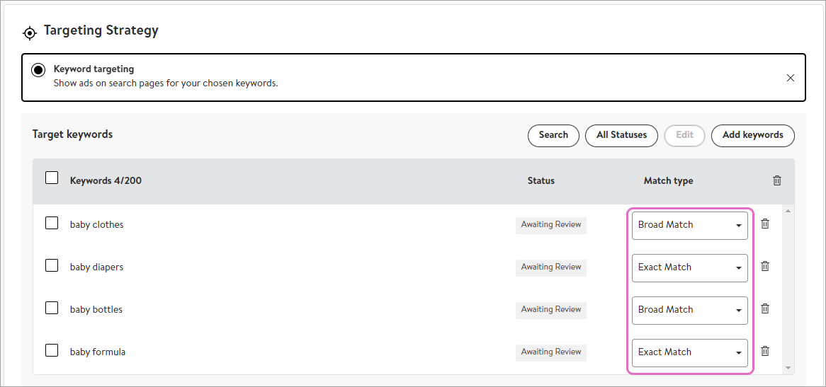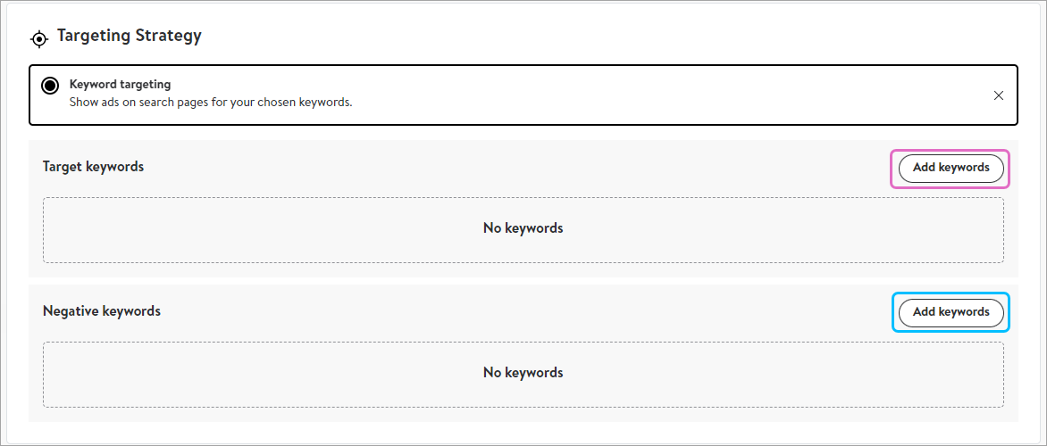 使用Keyword Targeting策略时,首先在Targeting Strategy处选择“Keyword targeting”,随后在Target Keywords处填写我们需要意向投放的关键词,在Negative keywords处填写我们需要排除的一些关键词。