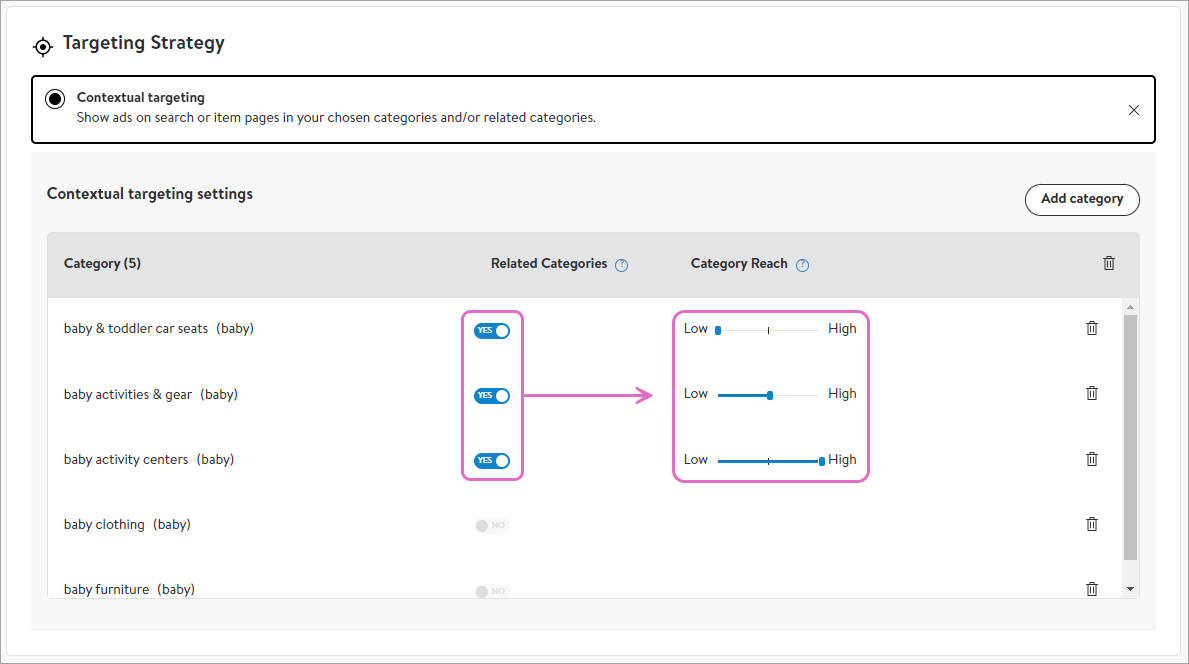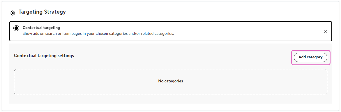 使用Contextual Targeting策略时,首先在Targeting Strategy处选择“Contextual targeting”,随后单击“Add category”。