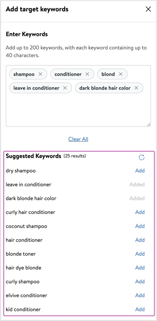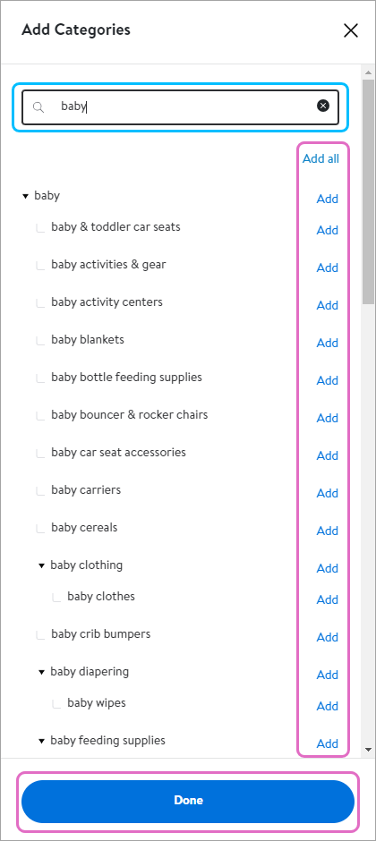 我们可以通过搜索关键词或者鼠标滚轮滑动的方式,点击“Add”,将指定品类投添加到广告活动中。