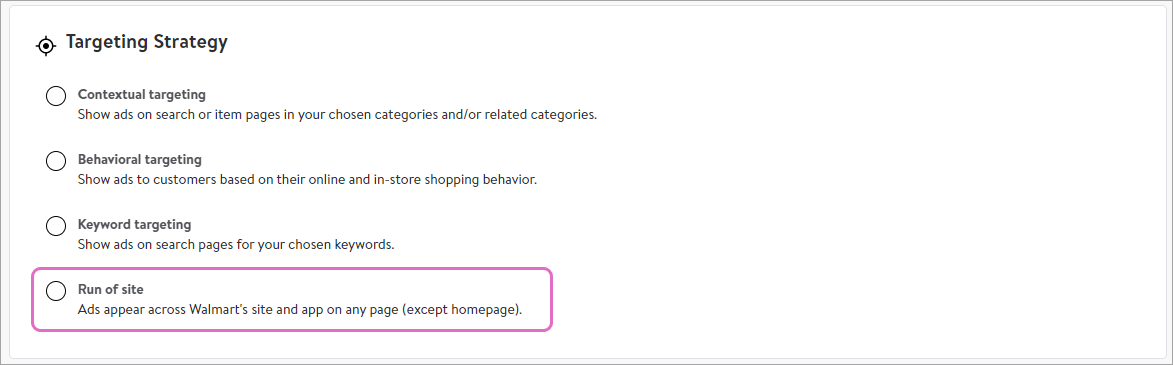 选择该投放策略不需要填写其他信息,直接在Targeting Strategy处选择“Run of site”即可。