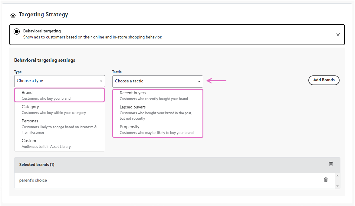 在Type里选择“Brand”,Tactic选择对应受众,并添加品牌。这里的品牌只能从该广告账户下拥有的品牌中选择,无法访问其他品牌。