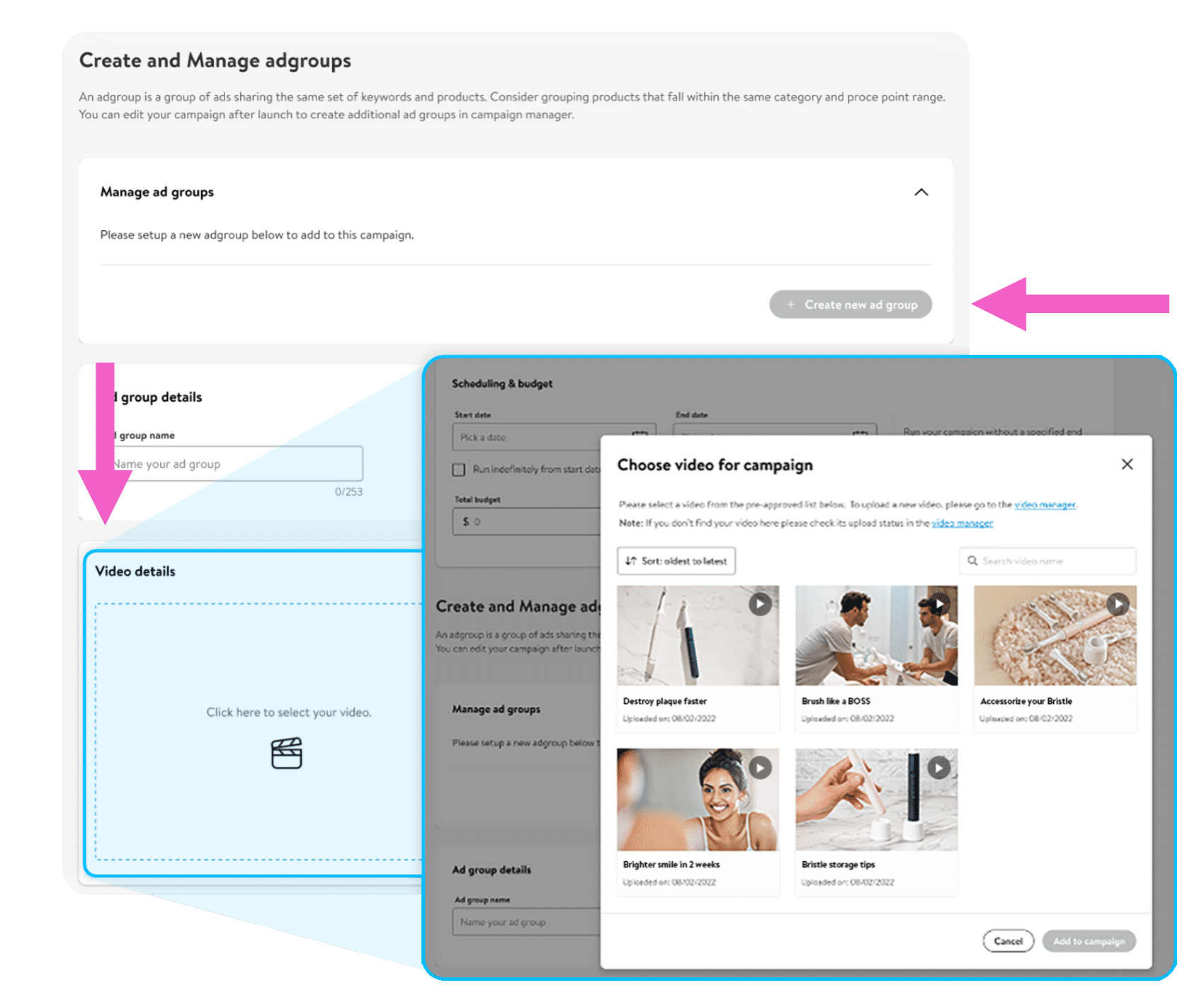 每个Sponsored Videos广告只支持一个Ad group。提供广告组名称后,在“Video details”处上传通过审核的视频素材。