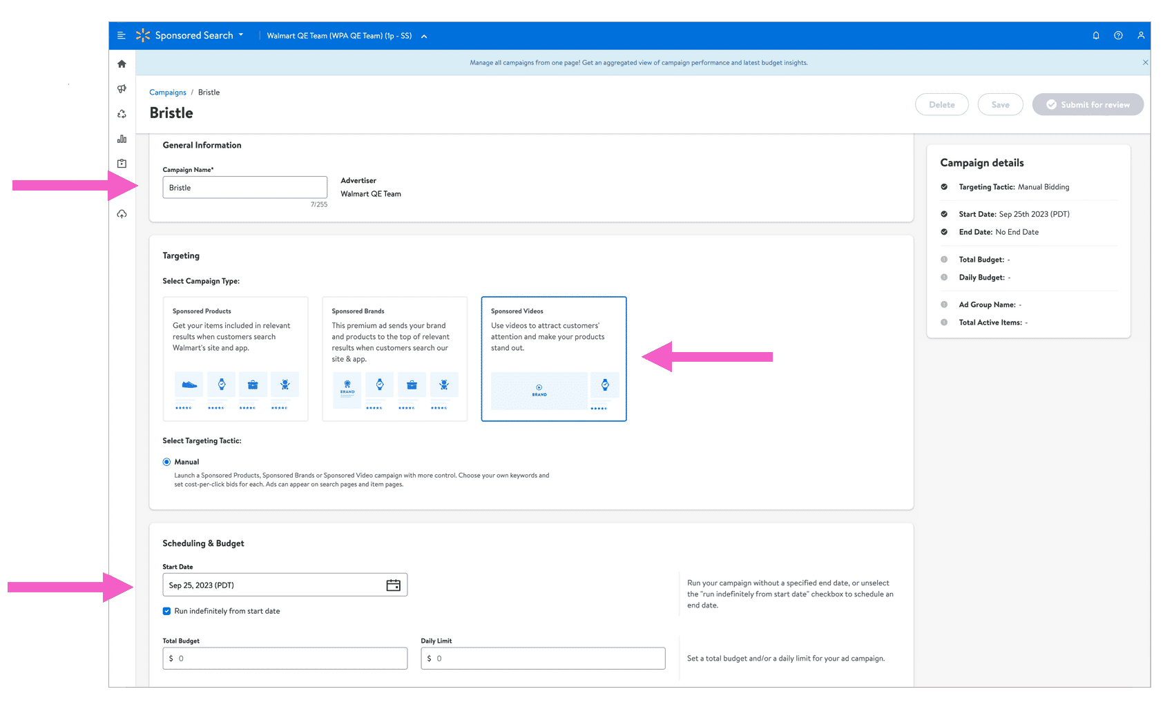选择“Create Campaign”后,填写广告名称。广告类型选择“Sponsored Videos”,系统将自动勾选“Manual”手动投放,因为Sponsored Videos只支持手动投放。填写广告开始、结束日期与总预算、日预算花费,总预算必须大于$100,日预算必须大于$50