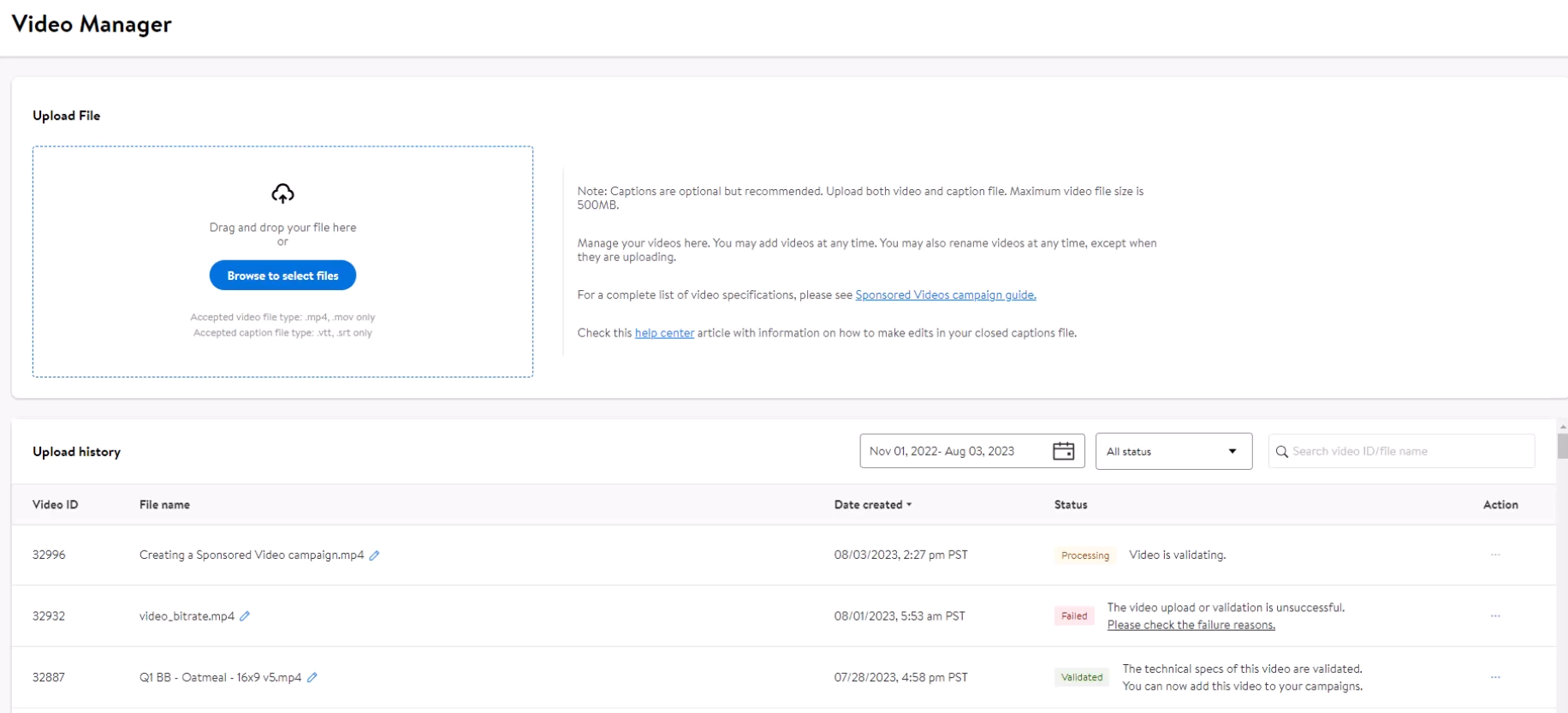 • Validated:这种情况代表视频素材审核通过。可以在接下来的Sponsored Videos广告活动中使用。