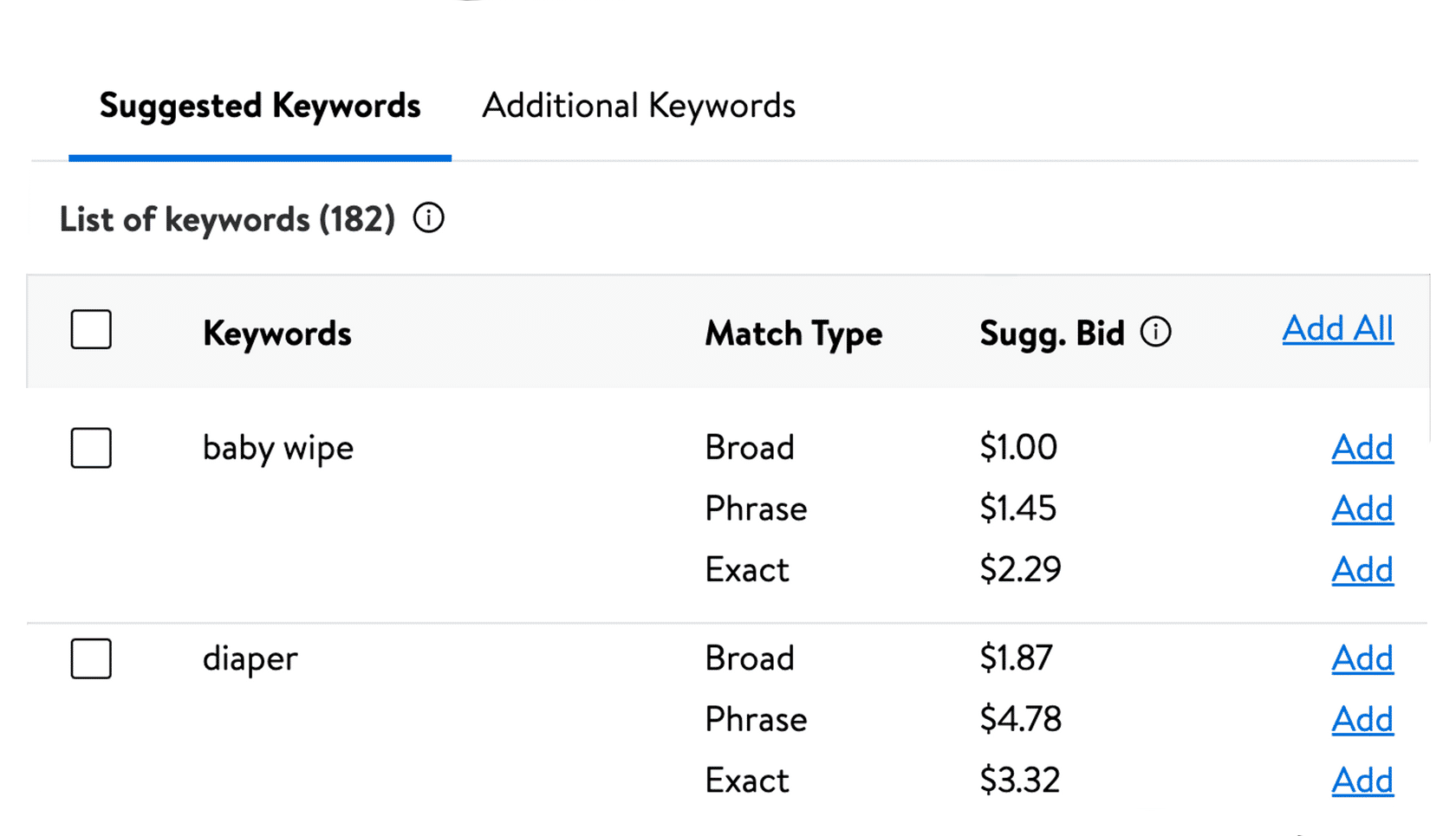 • Suggested Keywords:这项工具在广告创建初始就能根据所选商品推荐出最多220个相关的关键词,同时包含三种匹配类型与建议的竞价。