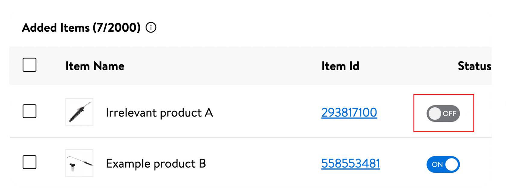 • 禁用商品/关键词:在图中所示位置直接找到不相关的商品/关键词,将他们的状态设置为“Disabled”。