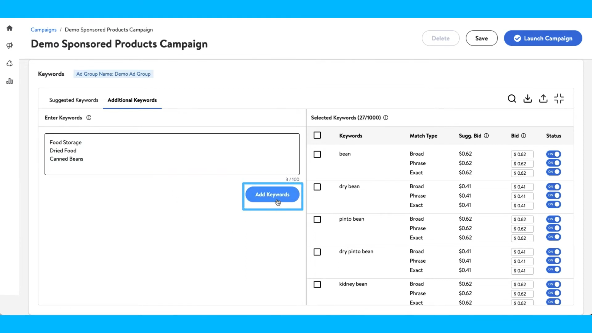 如果是手动投放,我们还需要给Ad group自行添加关键词。“Suggested Keywords”是系统根据我们选择的一系列商品给出的推荐关键词,我们可以直接勾选合适的关键词与匹配类型、竞价,单个广告组最多不超过220个关键词。