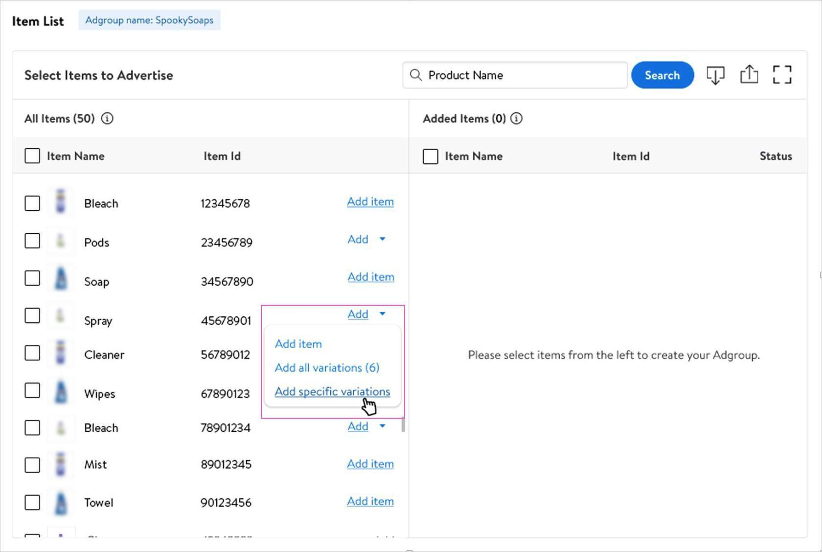 搜索框同样在右上角,可以通过搜索Item ID, Product Name, Brand Name, Keyword在左侧窗口看到items,如果产品存在多个变体需要投放,点击对应产品右侧的“Add”展开,“Add item”代表仅增加该变体商品,“Add all variations”代表增加这个商品的所有变体形式,“Add specific variations”代表增加选定的几个变体商品。