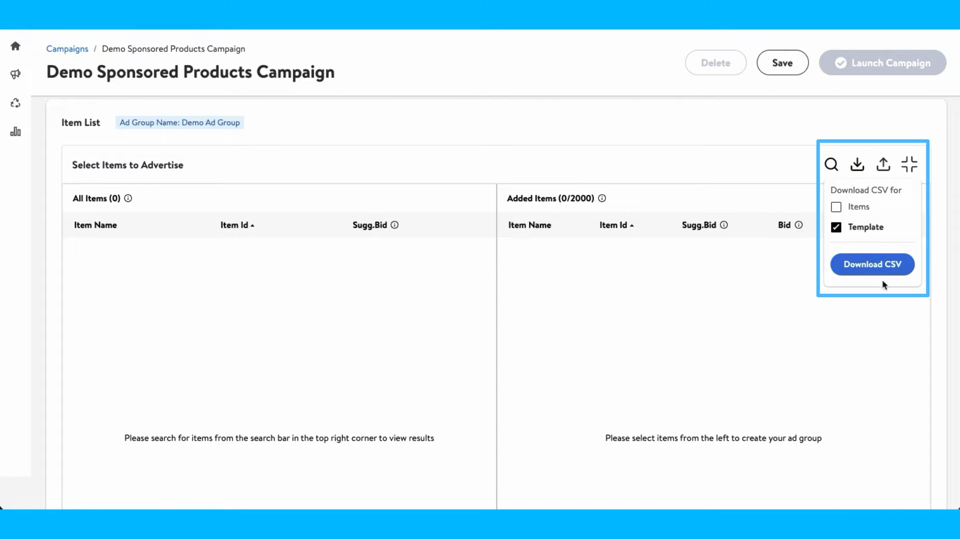 在填写广告组名称后,我们可以通过上传CSV文件或者搜索框输入的方式添加商品、竞价等信息。