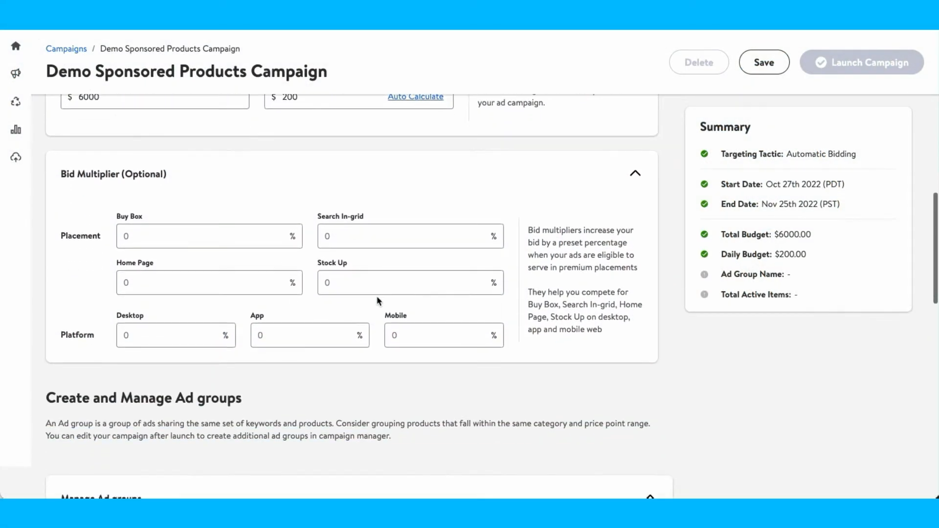 另外,我们还可以使用“Bid Multiplier”提高Placement(具体广告位置)或者Platform(投放设备)的竞价,以获取更优质的广告机会。其中,手动投放广告无法使用“Home Page”与“Stock Up”这两个位置的竞价调整。而且广告位置与投放设备的竞价可以叠加。