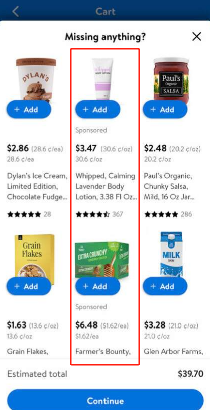 在购物车结账页面,广告将出现在消费者曾经购买过的商品的位置上,针对的是那些过去购买的类似商品。仅支持自动投放。