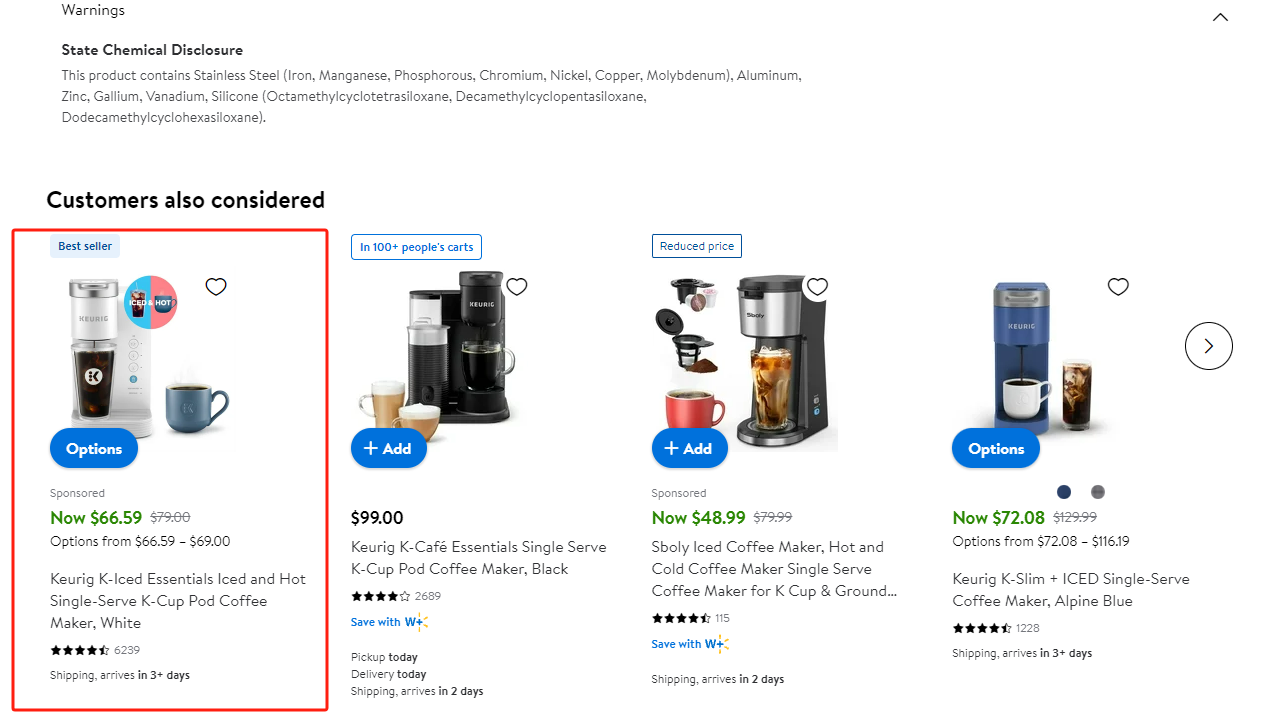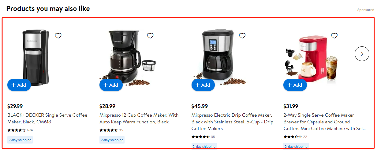 广告往往会根据用户独特的搜索与浏览行为,出现在沃尔玛首页或者相关商品页面的推荐中。该位置仅支持自动投放。