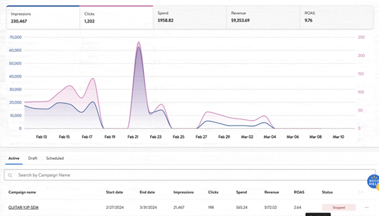 创建SEM广告后,您可以在SEM界面查看广告相关情况。在图表下方找到Active选项卡,点击对应的广告名称即可看见该广告的详情和具体商品的表现情况。