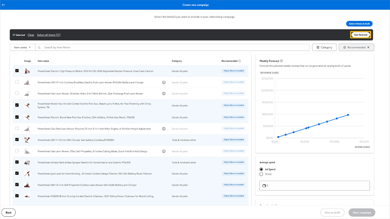 3. 选择好参与的商品后,点击右上角Get forecast。系统将根据所选商品的历史数据及您填写的预期广告费用(USD)或期望的ROAS,预测本次广告活动的花费/收入情况。如果所选商品的历史数据不足,可能无法完成预测,但是仍然可以参与SEM广告活动。