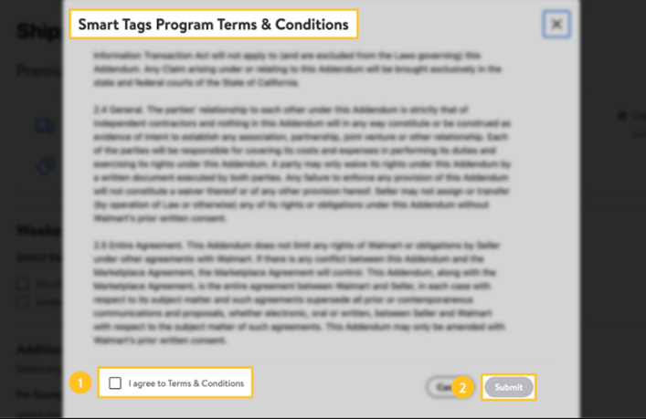 • 仔细阅读“Smart Tags Program Terms & Conditions”,明确双方权责,因为Smart Tags涉及可能需要沃尔玛统筹的加急运输服务,卖家签署这份条款才能让沃尔玛在特殊时刻代卖家管理,保障服务顺畅运行,因此如果您同意条款里的内容及要求,勾选条款左下方的“I agree to Terms & Conditions”,及右下方“Submit”确认,等待审核通过。