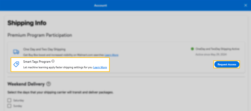 • 在“Shipping Info”页面导航至Smart Tags项目,申请过程的评判标准将基于卖家过往的一些指标表现,如按时送达率、客户满意度等指标,达到标准才能申请成功,多次配送逾期、预计配送时间过长等表现的卖家都无法获得权限,因此这督促卖家做好销售后端环节的配送管理。