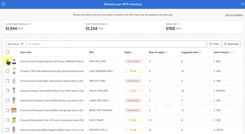 如果您要查看这些建议,请选择Success Hub > Restock these WFS items,在该页面勾选您想要补货的商品,点击右下角Send Inventory进入创建入库单流程,按照页面填写要求填写入库单,最后将创建的入库单发送至WFS即可。
