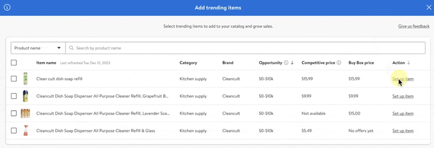 如果想要添加建议的趋势商品,请选择Success Hub > Grow your sales by adding trending items > Add items,在该界面,您将看见系统推荐的一系列商品,点击您想要添加的商品右侧的Setup Item链接,根据所选商品性质(沃尔玛现有商品/沃尔玛新商品),系统将跳转到对应的商品创建页面,引导您完成商品设置流程。