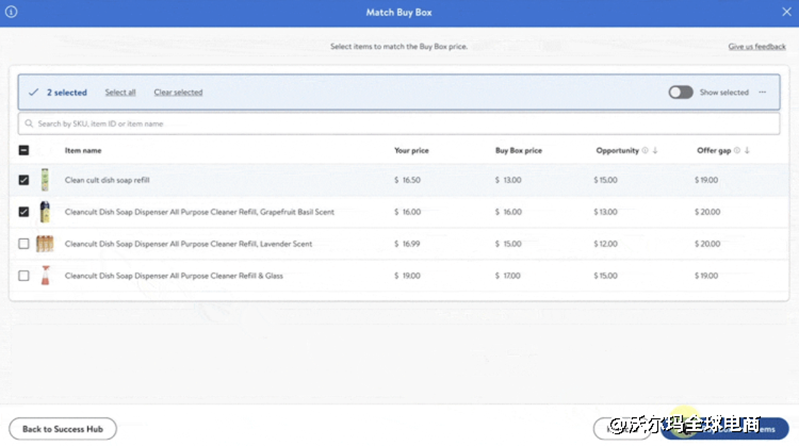 Success Hub可以对您的商品清单中的商品提出建议,这些商品通过之前介绍的运营工具Repricer提高价格方面的竞争力。根据您在Repricer设置的规则,它会监控沃尔玛及外部平台的商品价格,当满足触发条件时,价格将自动调整。
