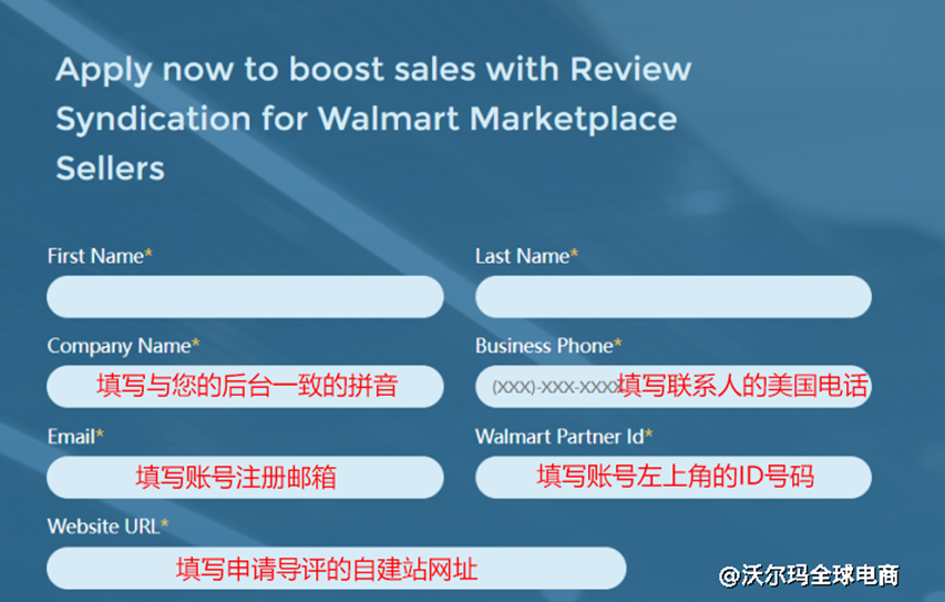 在申请沃尔玛平台导评服务时,注册时需注意结合下图中的提示填写: