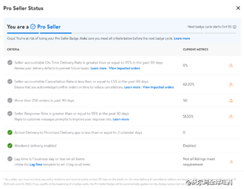 • Pro Seller badge at risk:您已在此前的两个刷新周期内获得专业卖家徽章,但是目前您还未符合所有条件,如果在下一周期刷新后仍未符合所有条件,您将在不再获得专业卖家徽章。