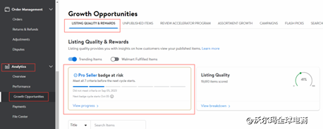 您可以在Seller Center左侧导航栏下选择“Analytics”下拉菜单中的“Growth Opportunities”,在该页面中点击“Listing Quality & Rewards”选项卡,查看自己是否满足专业卖家徽章要求: