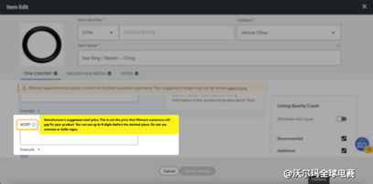 (1)List Price:指的是针对该商品的制造商建议零售价(MSRP)。对于非书籍类商品,如果商品在过去90天(季节性商品为过去180天)内被消费者在沃尔玛以List Price价格购买,或者被其他零售商相同或更高的价格销售,沃尔玛会将该List Price作为售价的基础,这也意味着尽管它可能不是商品的现行市场价,但沃尔玛仍会将其作为定价的参考点。