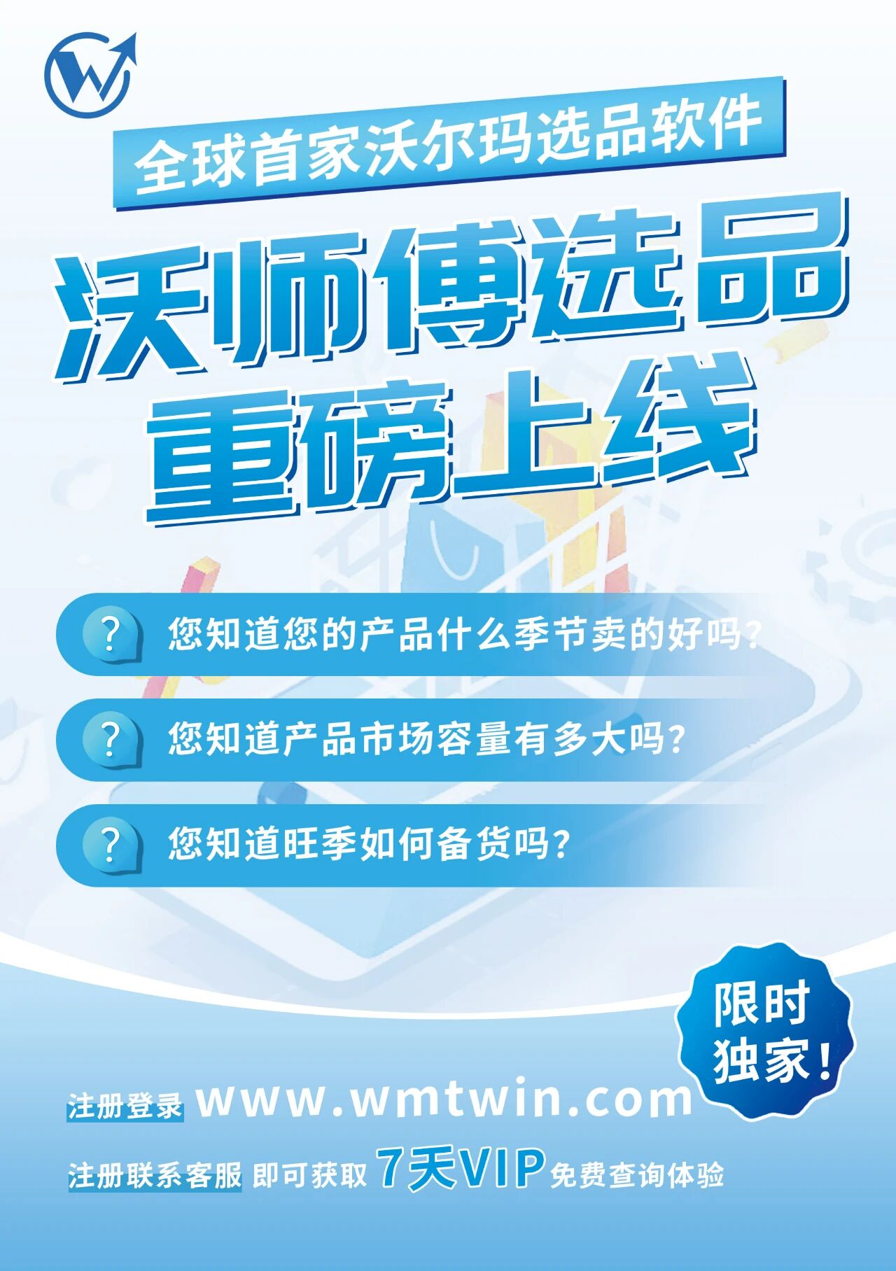 沃师傅选品现已重磅上线,注册登录网址www.wmtwin.com后,联系客服即可获取7天VIP免费查询体验!