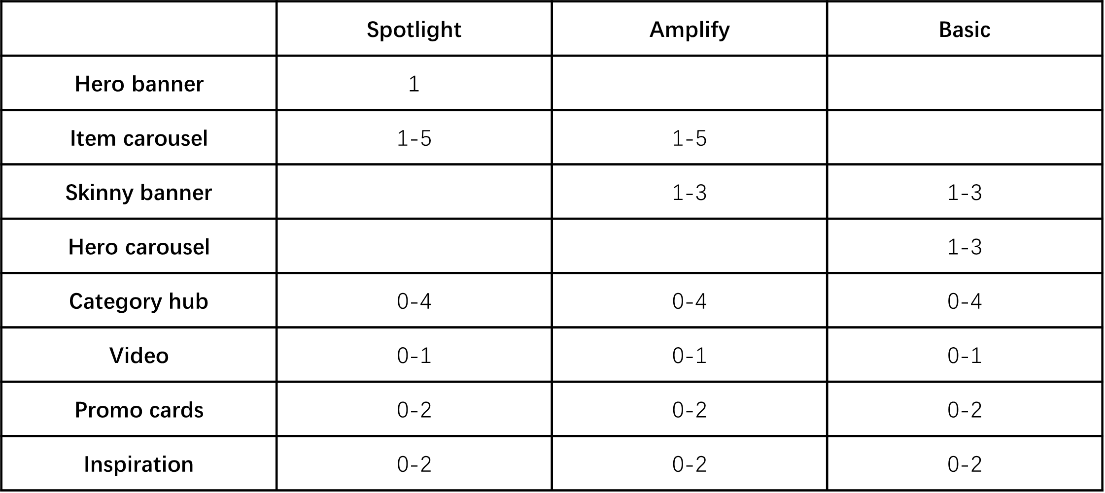 • Amplify:放大版是在Spotlight的基础上再升级的模板,新增Skinny banner板块,更利于宣传我们的品牌。基本要求是必选Skinny banner、Item carousel,可选Category hub、Video、Promo cards板块。