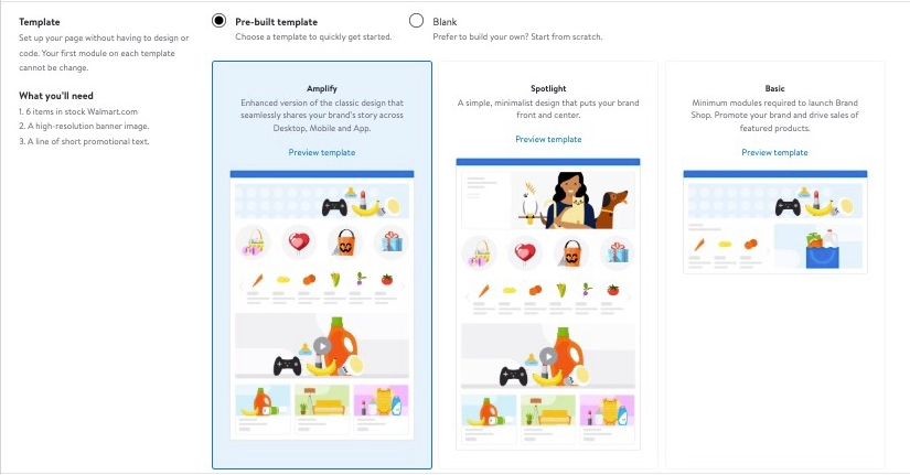 在品牌商店构建阶段,沃尔玛预先提供三种模板可供选择: