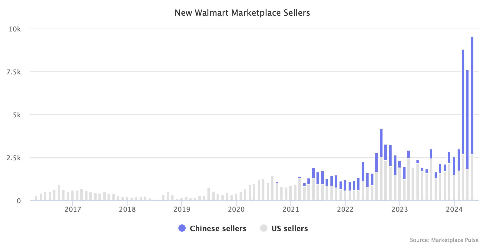 沃尔玛作为全球最大的零售商之一,其电商业务在近年来经历了显著的增长。沃尔玛于2021年3月8日正式开放中国卖家入驻,通过实施“新卖家扶持”计划,积极吸引更多的第三方卖家。据MarketplacePulse数据,那一年,沃尔玛卖家数量从2021年的6.9万翻了大约一倍,23年达到了约13万,24年可能达到20+万。到了2023年,沃尔玛网站上销售的产品中高达95%来自于第三方卖家,其第三方卖家的增速甚至已经超越了亚马逊。