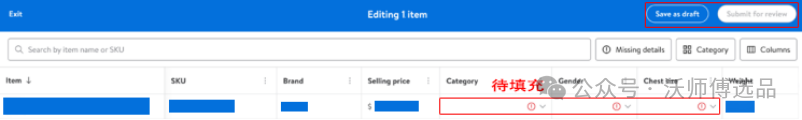 通过页面顶部搜索栏、Missing details、Category或Columns选项对商品进行排序和筛选。以Missing details为筛选条件,您将会看到需更新的单元格将显示红色图标,必须更新所有必填单元格才可以提交审核。未填写完整,您将无法提交至沃尔玛平台审核(右上角Submit for review按钮将显示为灰色),只能另存为草稿供后续编辑(右上角Save as draft)。